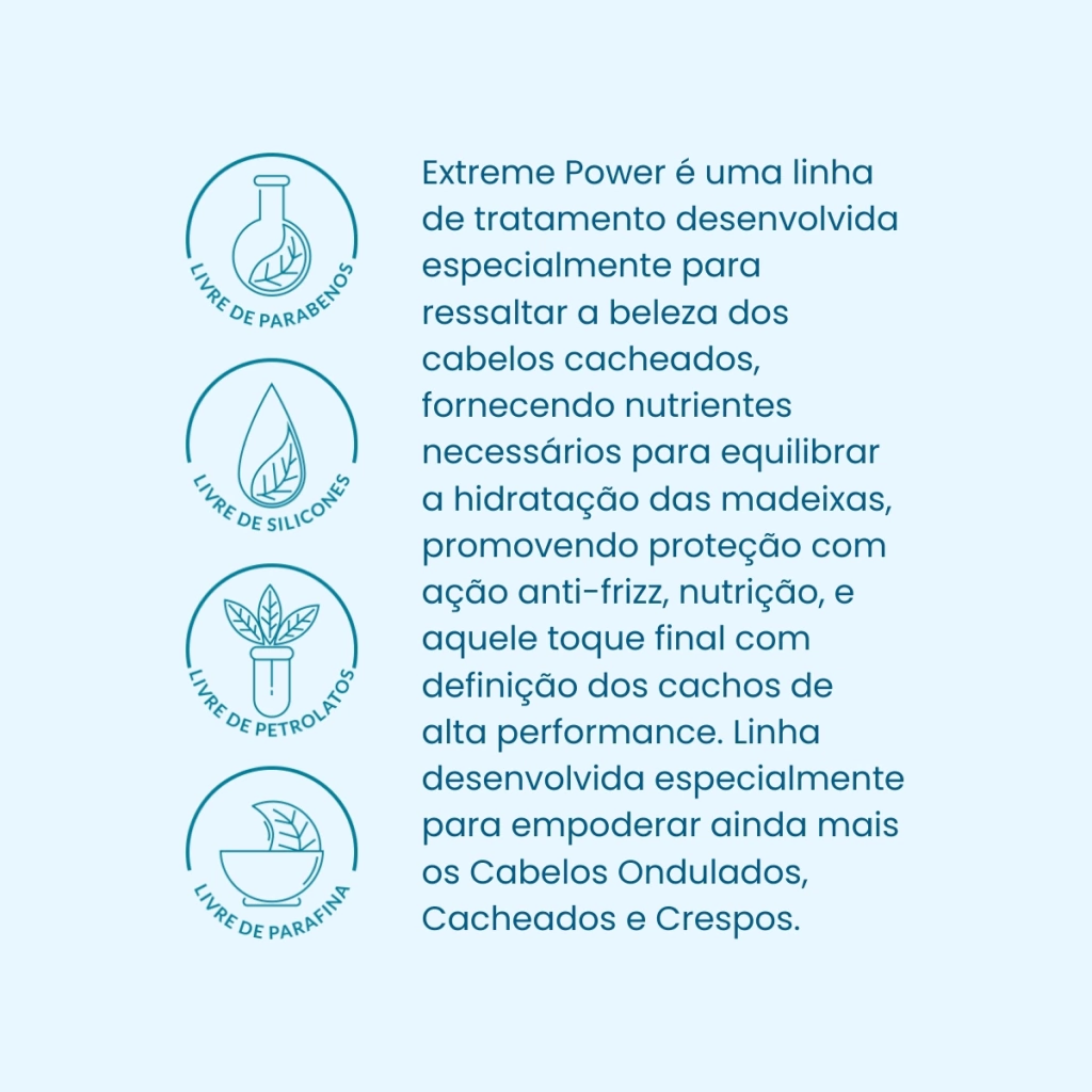 A Linha Extreme Power foi desenvolvida especialmente para realçar a beleza dos cabelos ondulados, cacheados e crespos, proporcionando um tratamento completo que respeita a curvatura natural dos fios. Sua fórmula avançada entrega os nutrientes essenciais para equilibrar a hidratação profunda, garantindo cabelos saudáveis, macios e brilhantes. Além de proporcionar ação anti-frizz e definição de alta performance, a linha oferece proteção duradoura contra agressões externas, mantendo os cachos modelados e com movimento natural. A sensação de limpeza e suavidade nos fios complementa a experiência, promovendo leveza e empoderamento para os cabelos.