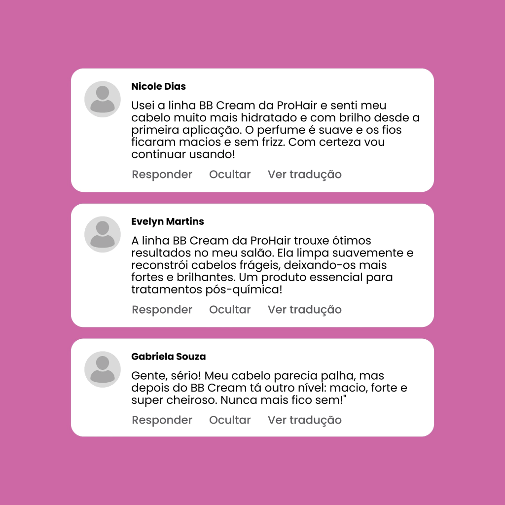 - Indicação: A Máscara BB Cream da ProHair é indicada para todos os tipos de cabelo, especialmente para fios ressecados, danificados e fragilizados. Ela entra na etapa de reconstrução do cronograma capilar, sendo ideal para cabelos que necessitam de um tratamento intensivo de fortalecimento, restauração e hidratação. Proporciona vitalidade e saúde aos fios, tornando-os mais resistentes, sedosos e com brilho intenso.