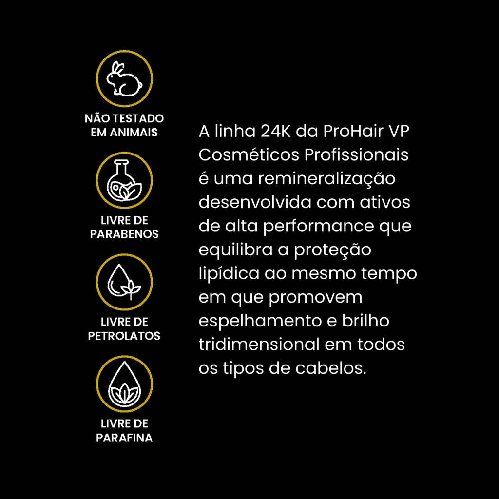 A Linha Ouro 24K da ProHair é uma solução avançada para ter cabelos hidratados e com brilho intenso. Formulada com ativos de alta performance, essa linha oferece uma remineralização profunda, agindo diretamente no córtex capilar para restaurar a proteção lipídica e garantir fios mais saudáveis. Enriquecida com Óleo de Argan, Queratina e Damasco, promove hidratação de longa duração, revitalizando os fios. Com efeito de brilho tridimensional, a linha proporciona um brilho radiante e um toque macio, ideal para todos os tipos de cabelo em específico, opacos. É a escolha perfeita para quem busca hidratação profunda, proteção e um brilho excepcional.