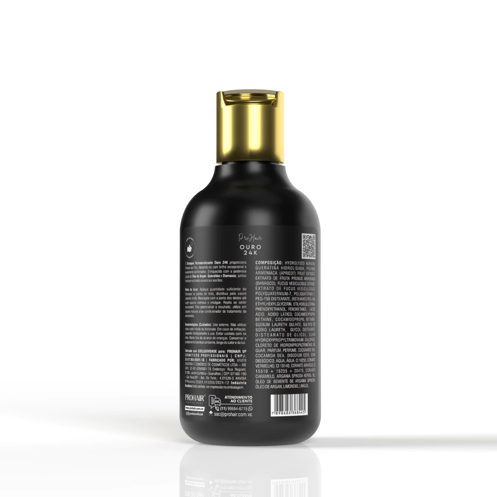 O Shampoo Ouro 24K da ProHair proporciona uma limpeza suave, deixando os cabelos com brilho excepcional e perfume agradável. Enriquecido com Óleo de Argan, Queratina e Damasco, nutre e hidrata os fios, restaurando a vitalidade e promovendo brilho tridimensional.